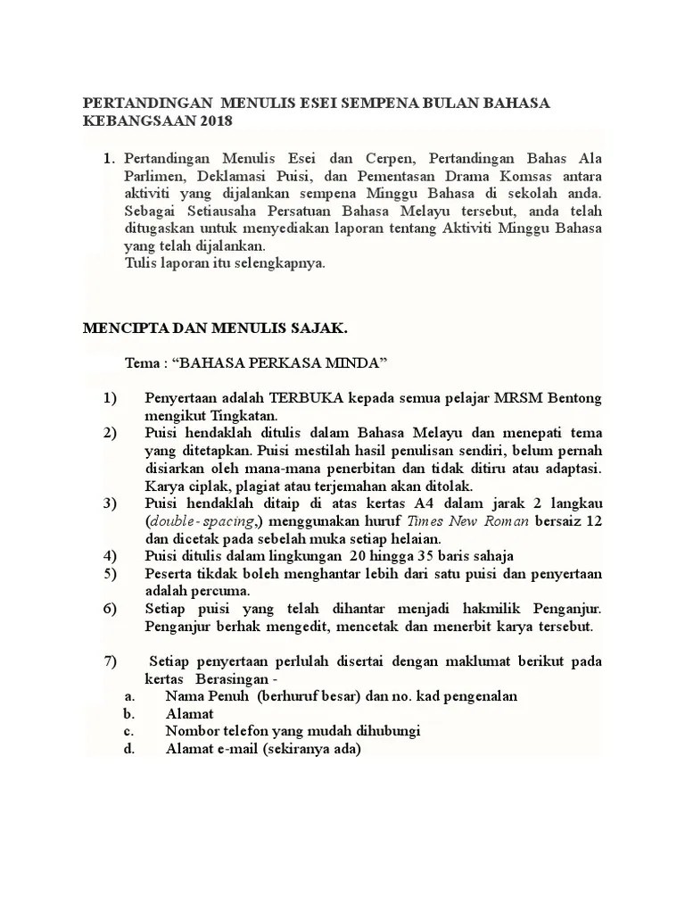 Karangan Bulan Bahasa Kebangsaan : Objektif utama kempen ini adalah untuk memupuk perasaan sayang dan bangga akan.. Sembang santai karangan pendek bahasa melayu menengah rendah. Sebagai contoh, sekolah perlu diwajibkan mengadakan program bahasa sempena bulan bahasa kebangsaan (bbk) seperti safari membaca dan maraton. Anda ingin melanggan majalah dewan pelajar selama 7 bulan. Contoh karangan laporan minggu bahasa kita barabekyu cute766. Karangan semi ilmiah ditulis dengan bahasa yang non formal karena penyusunannya tidak mengikuti aturan secara baku.