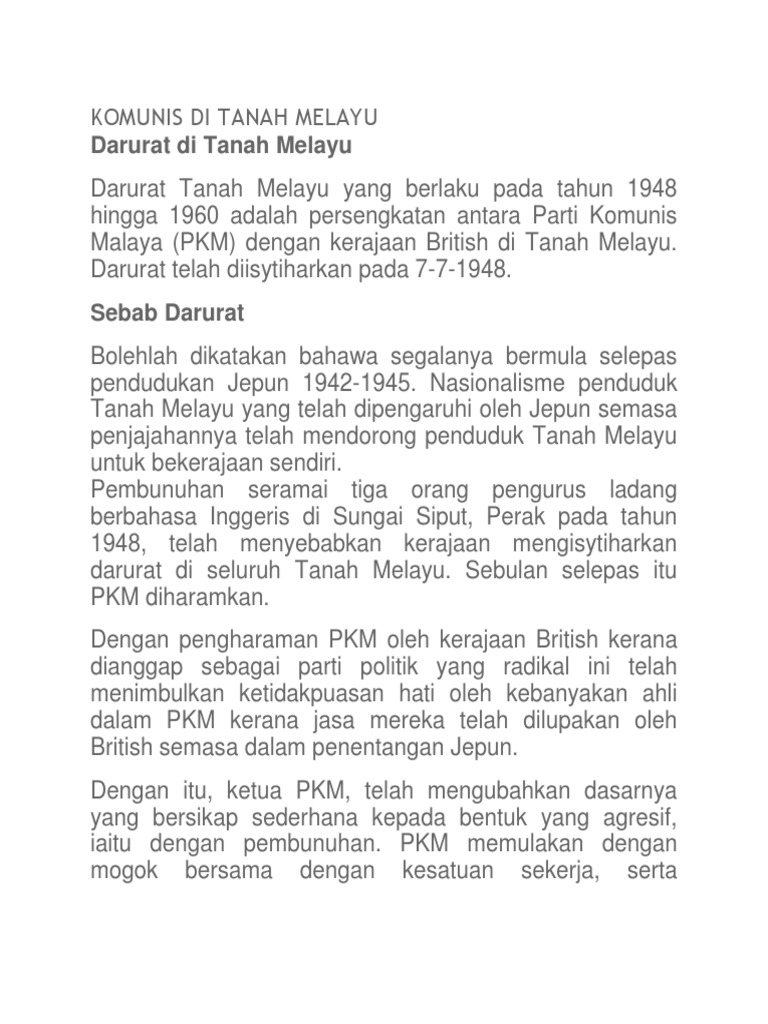 Bab 6 Ancaman Komunis Dan Pengisytiharan Darurat Flip Ebook Pages 1 8 Anyflip Anyflip from online.anyflip.com Beliau juga telah mengisytiharkan kawasan putih dan kawasan hitam. Kawasan putih dan hitam telah diperkenalkan supaya british boleh memudahkan proses mereka dalam membanteras komunis. Melalui pengisytiharan ini kegiatan gerila dapat dikawal dengan baik dan berkesan. Kawasan putih adalah bermaksud kawasan tersebut telah bebas daripada anasir. Antara semua negeri, melaka adalah negeri yang pertama mendapat gelaran kawasan putih. F7 memperkenalkan kawasan hitam dan kawasan putih. Di tanah melayu kegiatan perlombongan dan perladangan getah telah dijalankan secara besar besaran bagi memenuhi keperluan perkilangan di britain. Kawasan hitam ialah kawasan yang didapati giat dengan aktiviti komunis dan perlu diberi kawalan ketat oleh pihak pertahanan.